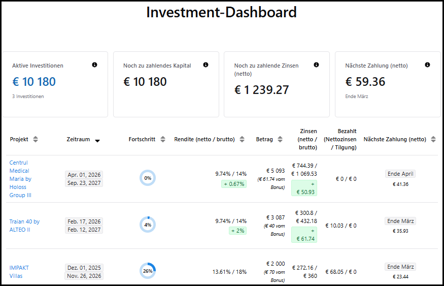 So sieht mein Dashboard mit meinen 3 Investitionen zur Zeit aus: