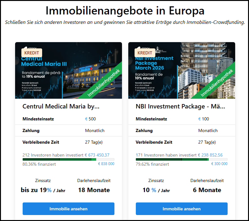 Bei Stock.estate investiere ich in besicherte Immobilienprojekte aus Rumänien mit höheren Zinsen. Im November 2025 habe ich meine erste Testinvestition getätigt. Da alle Raten bisher pünktlich zurückgezahlt werden, habe ich mich entschieden, mein Portfolio zu erhöhen.