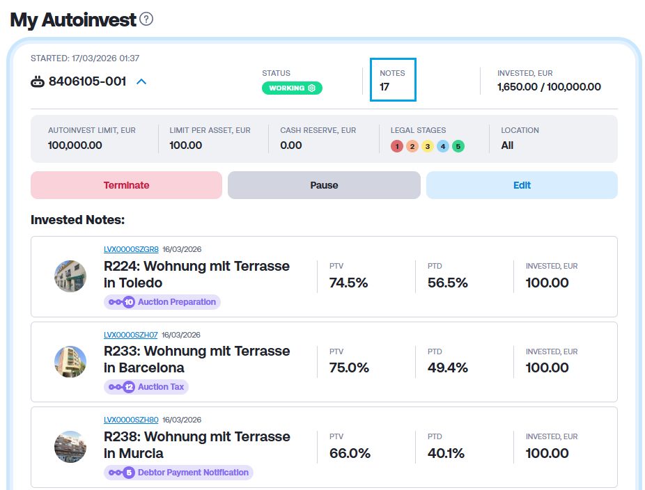 Zurzeit habe ich keine Investitionen bei Twino mehr. Wegen der zuletzt positiven Nachrichten überlege ich mir wieder mit einem Investment zu beginnen. Zurzeit gibt es polnische Kredite mit 12 % jährlichen Zinsen. Über den Zweitmarkt kann man jederzeit ohne Gebühren aussteigen und die Kredite an andere Anleger verkaufen. Zurzeit reicht schon ein Abschlag von 0,1 % aus und man wäre ganz oben auf dem Zweitmarkt und könnte relativ schnell seine Investments verkaufen.