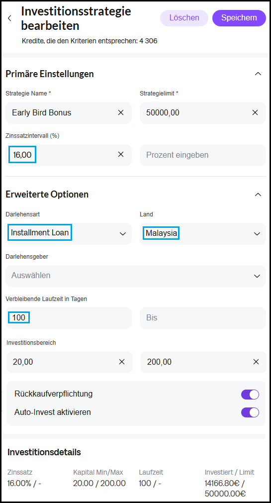 So sieht die Übersicht des AutoInvests aus: