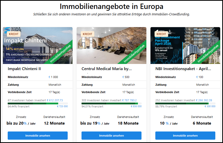 Bei Stock.estate* investiere ich in rumänische Immobilien-Projekte. Im April habe ich dieses mal über 4.800 € in ein Wohnprojekt mit 8 Wohneinheiten investiert. Damit habe ich mein Portfolioziel von 15.000 € bei der regulierten Immobilien-P2P-Plattform erreicht.