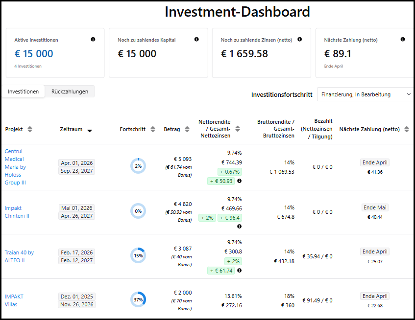 Nun bin ich mit 15.000 € in 4 verschiedene Projekte weit weg vom Baltikum investiert. Ab Ende Mai 2026 erhalte ich auf alle Projekte die vollen Zinsen.