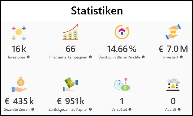 Stock.estate scheint eine gute Auswahl bei den Projekten zu machen. Es wurden schon 66 Kampagnen finanziert und es befindet sich weiterhin nur ein Projekt in Verzug (Beitreibung). Ausgefallen ist noch kein Projekt.