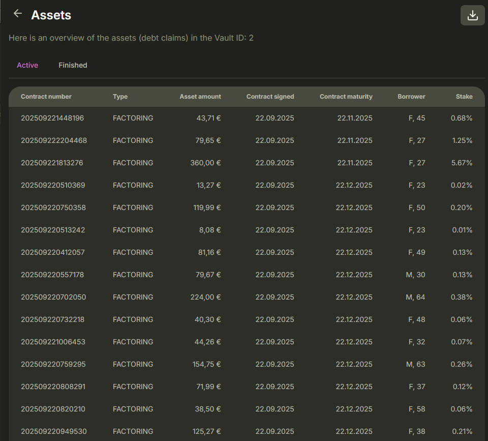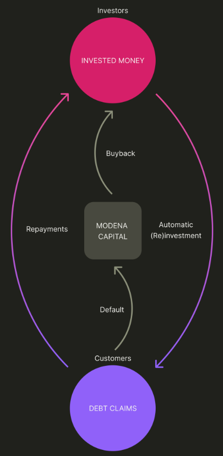 Sobald bei Modena in einen „Loan Vault“ investiert wird, erwerben Anleger automatisch Forderungen (Vermögenswerte) von Modena. Das sind Forderungen gegenüber Kunden, die einen Kredit oder eine Sofortkauf-Finanzierung bei Modena abgeschlossen haben.