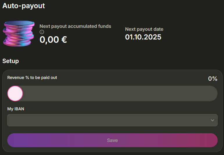Mit dem Auto-Payout ist möglich einen Prozentsatz der Gewinne festzulegen, welcher monatlich auf das Bank Referenzkonto ausgezahlt wird. Einmal festgelegt werden immer zum ersten des Monats einen Teil oder alle Profite auf das Bankkonto ausgezahlt.