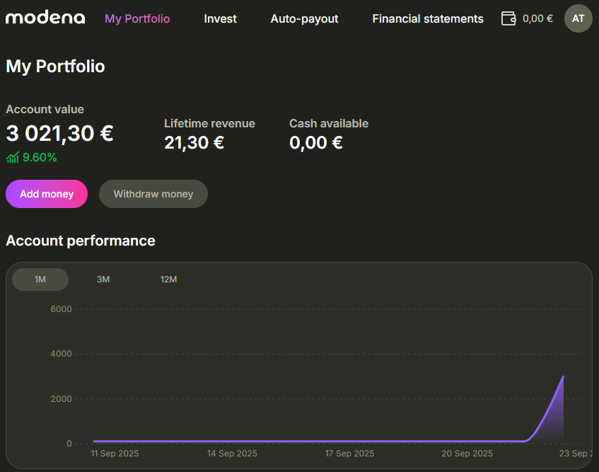 Ich habe 3.000 € zum Start eingezahlt und in Kredite bei Modena investiert.