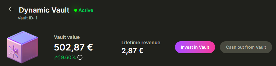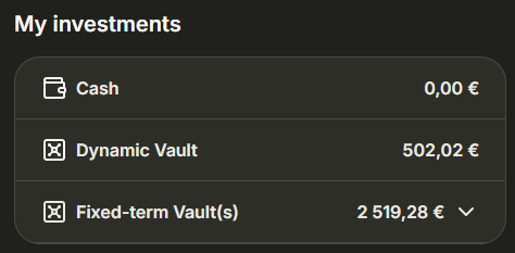 Ich habe 500 € in den Dynamic Vault mit einem Monat Laufzeit investiert und 2.500 € in den Fixed-term Vault mit 12 Monaten Laufzeit investiert.