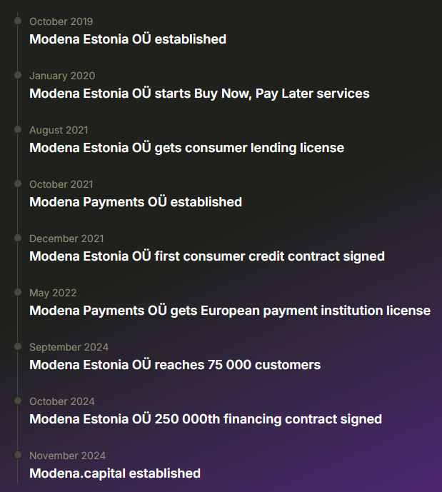 Im Jahr 2024 erhielt Modena Payments OÜ von der Finanzaufsichtsbehörde eine grenzüberschreitende Betriebslizenz für Zahlungsdienste in Lettland und Litauen. Im Jahr 2024 initiierte Modena Payments über 221.000 erfolgreiche Zahlungen im Gesamtwert von über 13,5 Millionen Euro. Die Ziele für 2025 sind die Ausweitung des Geschäftsbetriebs neben Estland auch auf Finnland, die baltischen Länder, Lettland und Litauen.