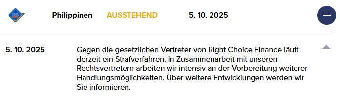 Sollte ich noch Zahlungen von „RightChoice Finance“ in Zukunft erhalten, reduziere ich meine Abschreibungen und zähle Rückzahlungen dann wieder als Einnahmen.