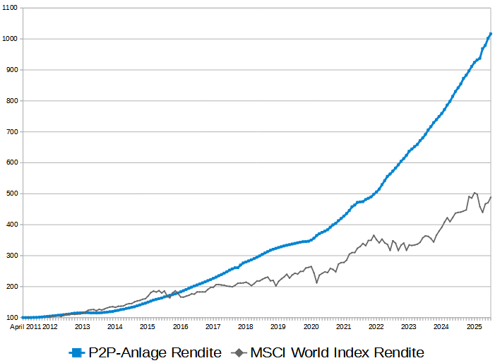 Weiterhin stehe ich bei über doppelt so viel Rendite wie der MSCI World seit 2011! In etwas mehr als 14 Jahren konnte ich mein P2P Anfangsportfolio durch die Rendite insgesamt verzehnfachen (Von 100 Punkte auf über 1.000 Punkte). Natürlich nur wenn ich am Anfang nur eine Summe investiert hätte und danach alles immer reinvestiert hätte.