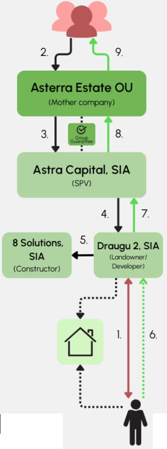 • 8. Darlehensrückzahlung an Asterra Estate OU ▶ Astra Capital SIA zahlt Zinsen und/oder Tilgung an Asterra Estate OU zurück, basierend auf den von Draugu 2 SIA erhaltenen Mitteln.