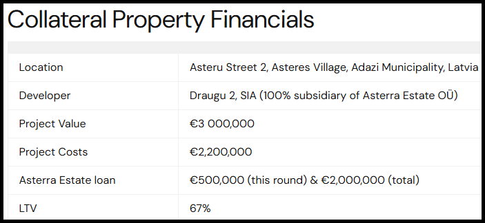 Das Darlehen ist durch ein 8.510 m² großes Grundstück sowie das 1.095 m² große Luxushausprojekt abgesichert. Es befindet sich in der Asteru-Straße 2, Asteres Village, Garkalne, Gemeinde Adazi, Lettland