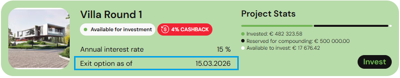 Alle Projekte haben eine Early Exit Möglichkeit, welche 6 Monate nach dem Start des Projekts möglich wird. Bei jedem Projekt sieht man den Tag ab wann es möglich ist die Investition zum Verkauf einzustellen: