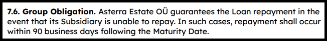 • 3. Konzerninterner Darlehensvertrag mit Zweckgesellschaft ▶ Asterra Estate OU überträgt die Darlehensmittel zu gleichen Bedingungen an ihre 100%ige Tochtergesellschaft Astra Capital SIA, eine Zweckgesellschaft (SPV). Asterra Estate OU garantiert das Darlehen und übernimmt die volle Verantwortung für die Rückzahlung (Gruppengarantie).