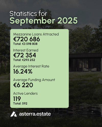 Im Juni 2025 ging Asterra Estate online. Ich habe die Plattform in den ersten Monaten beobachtet. In nur wenigen Monaten bis heute wurden 3,6 Mio. € an Kreditvolumen finanziert.