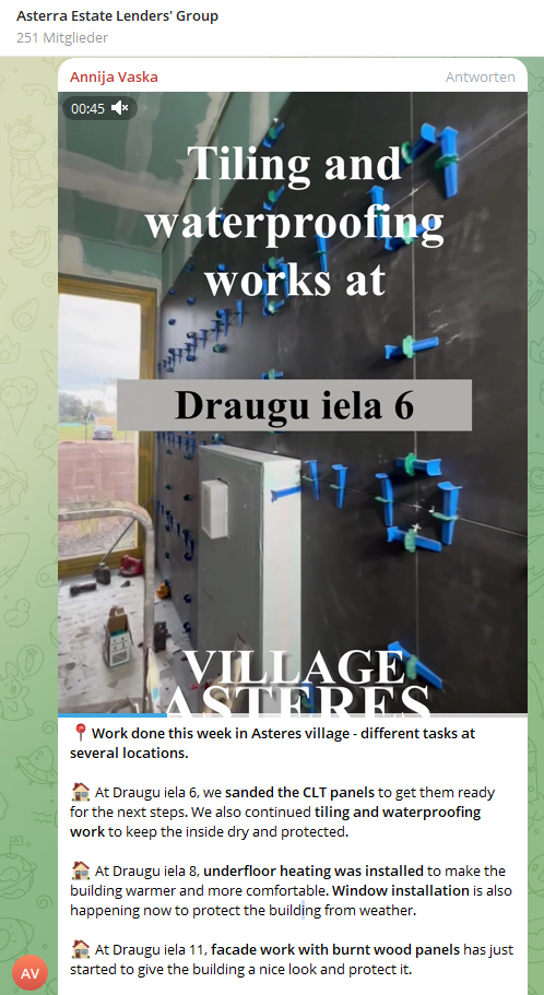 Jeder Anleger erhält automatisch nach der ersten Investition bei Asterra eine Einladung zur eigenen Telegram-Gruppe per Email. In der Gruppe gibt es auch regelmäßig Updates. Zum Beispiel im Videoformat was alles zur Zeit gemacht wird: