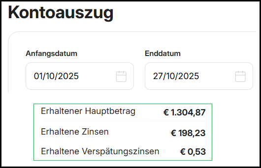 Meine erhaltenen Zinsen steigen Monat für Monat. Im Juli 2025 habe ich noch 25,80 € Zinsen erhalten. Jetzt im Oktober sind es schon 198 €: