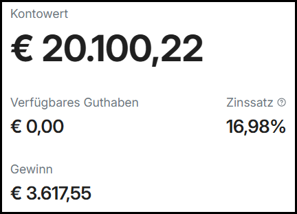 Da ich jetzt auf die vollen 20.000 € erhöht habe, erwarte ich ab November ca. 283 € Zinsen.
