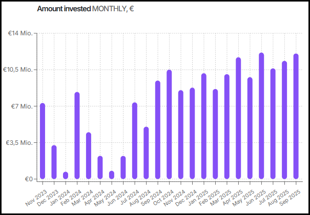 Im September wurden bei Lendermarket 12,05 Mio. € in Kredite investiert. Das war der zweitbeste Monat der Geschichte. Nur im Monat Juni 2025 investierten Anleger noch mehr: