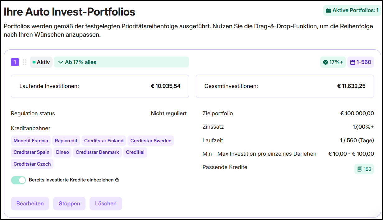 Damit ich nicht immer manuell nach Kreditangeboten suchen muss, habe ich meinen Auto-Invest so eingestellt: