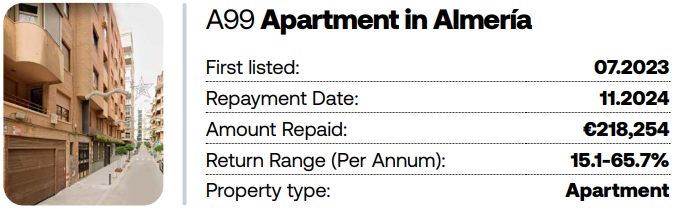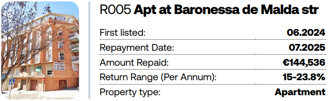 Im Jahr 2025 wurden schon 8 Schuldverschreibungen zurückgezahlt. Im Oktober wurde die Investition R099 zurückgezahlt. Im Schnitt konnten Anleger bei der Wohnimmobilie in Barcelona 30 % Rendite pro Jahr verdienen. Die Einzelrenditen lagen zwischen 27 % und 38 % pro Jahr. Dies liegt daran, dass die Rendite jeder Investition vom Zeitpunkt der Anlage im Schulden-Eintreibungsprozess abhängt. Frühere Investitionen erzielen aufgrund niedrigerer PTV-Verhältnisse oft höhere Renditen. Schuldverschreibungen in früheren Erholungsphasen bieten niedrigere Preise, können aber längere Erholungszeiten erfordern. Dagegen ermöglichen Schuldverschreibungen in späteren Phasen schnellere Ausstiege, jedoch mit höheren PTVs (Price-to-Value) einhergehen.
