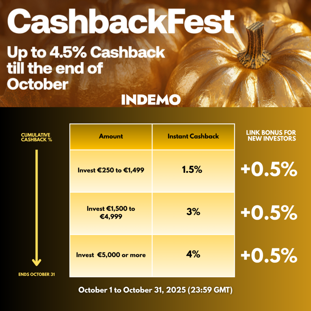 Jetzt im Oktober gibt es bei Indemo eine Cashback-Aktion von bis zu 4% Sofort-Bonus für alle Anleger.