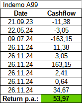 Ich hatte mehrmals in diese Schuldverschreibung investiert. Zunächst im September 2023, anschließend nochmals im Mai 2024 und im Juli 2024 investiert. Die Gesamtrendite betrug für mich sehr gute 54 % pro Jahr. Das ist die tatsächlich erzielte Rendite auf das Kapital: