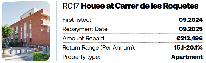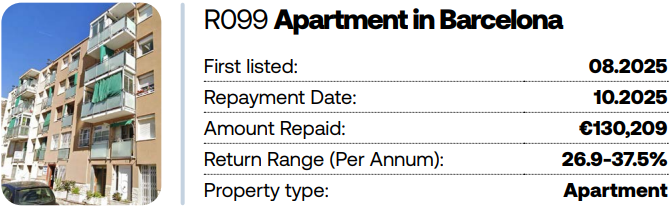 Im Jahr 2025 wurden schon 8 Schuldverschreibungen zurückgezahlt. Im Oktober wurde die Investition R099 zurückgezahlt. Im Schnitt konnten Anleger bei der Wohnimmobilie in Barcelona 30 % Rendite pro Jahr verdienen. Die Einzelrenditen lagen zwischen 27 % und 38 % pro Jahr. Dies liegt daran, dass die Rendite jeder Investition vom Zeitpunkt der Anlage im Schulden-Eintreibungsprozess abhängt. Frühere Investitionen erzielen aufgrund niedrigerer PTV-Verhältnisse oft höhere Renditen. Schuldverschreibungen in früheren Erholungsphasen bieten niedrigere Preise, können aber längere Erholungszeiten erfordern. Dagegen ermöglichen Schuldverschreibungen in späteren Phasen schnellere Ausstiege, jedoch mit höheren PTVs (Price-to-Value) einhergehen.