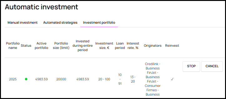 In jeden Kredit soll mindestens 20 € und maximal 100 € investiert werden. Der Zinssatz ist auf mindestens 13 % eingestellt. Ich habe alle Kreditunternehmen ausgewählt. In meinem Portfolio sind aber nur spanische Finjet Kredite.