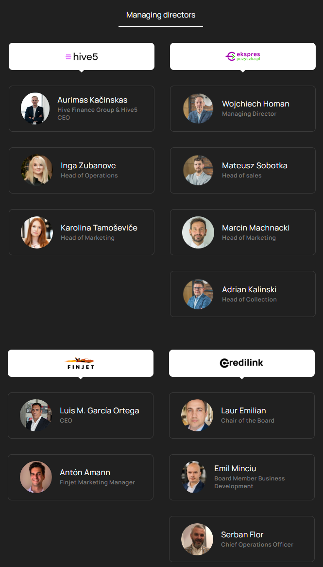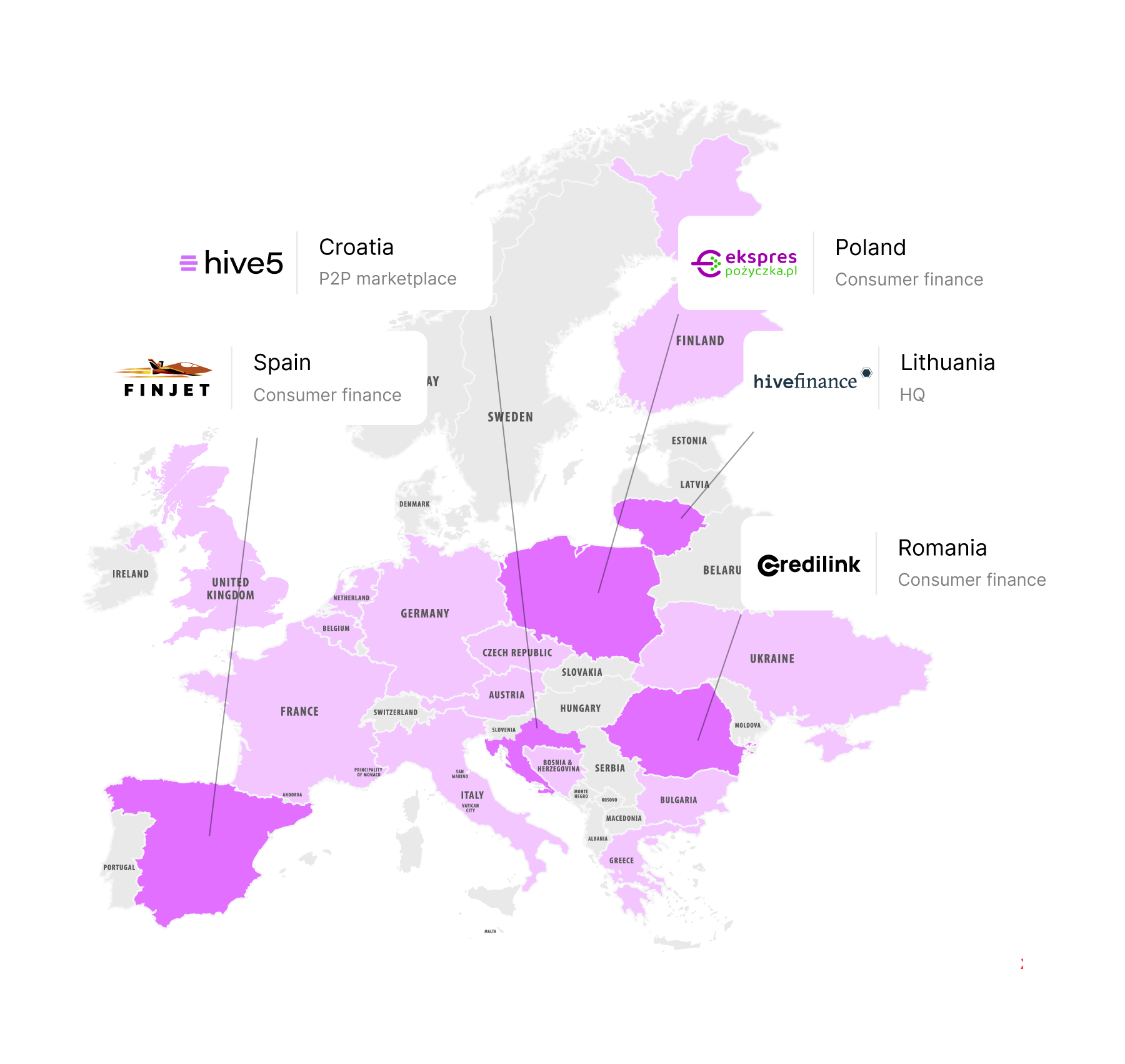 - Die Hive Finance Group (einschließlich Hive5 Marketplace, Ekspres Pozycka, Credilink, Finjet) – nun die neuesten Mitglieder der Gruppe
