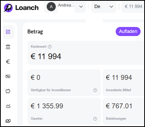 Seit 14 Monaten bin ich Anleger bei Loanch. In dieser Zeit habe ich bereits 2.123 € Gewinn erzielt.