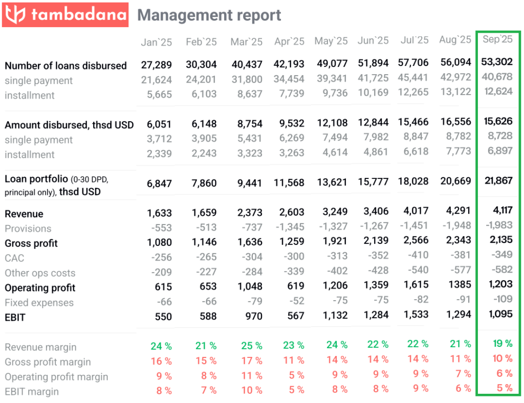 Loanch* veröffentlicht monatlich im Management Report mehrere Geschäftskennzahlen zum größten Kreditunternehmen Tambadana aus Malaysia. Erstmals sank die Umsatzmarge (Revenue Margin) in einem Monat bei Tambadana auf unter 20 %. Im Jahr 2025 lag die Umsatzmarge bisher zwischen 21 % und 25 %.