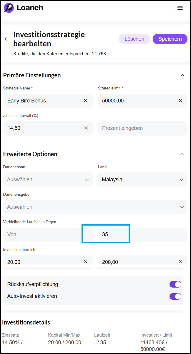 Ich habe meinen Loanch-Auto-Invest angepasst. Zuvor war er auf eine Restlaufzeit von 45 Tagen eingestellt. Das habe ich nun geändert und auf 35 Tage reduziert. Damit erhöhe ich meine Liquidität und die Rückflüsse. Sollte es beispielsweise zu einer Zinserhöhung kommen, kann ich schneller in höher verzinste Kredite investieren, weil meine Kredite vorher abbezahlt werden: