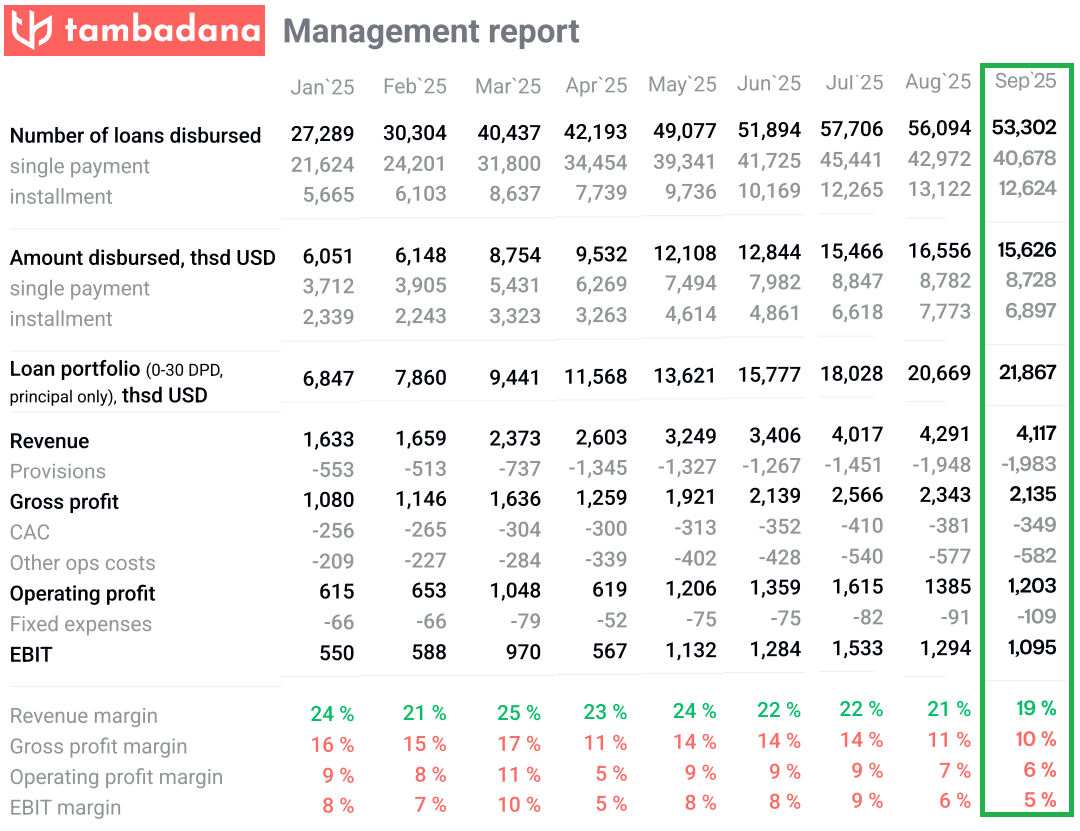 Loanch* veröffentlicht monatlich im Management Report mehrere Geschäftskennzahlen zum größten Kreditunternehmen Tambadana aus Malaysia. Erstmals sank die Umsatzmarge (Revenue Margin) in einem Monat bei Tambadana auf unter 20 %. Im Jahr 2025 lag die Umsatzmarge bisher zwischen 21 % und 25 %.