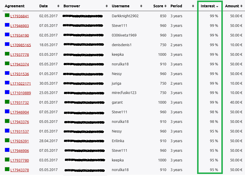 Die höchsten Zinsen, die jemals vergeben wurden, lagen bei 99 % pro Jahr. Dabei handelte es sich nicht um Monatskredite, sondern um Kredite mit einer Laufzeit von oft 2–3 Jahren. Nach Gebühren von Omaraha blieben für Anleger noch 69,3 % Nettozinsen pro Jahr bei diesen Darlehen.