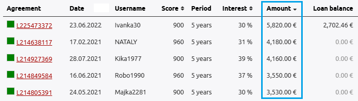 Anhand dieser Daten habe ich dann meine Investition getätigt. Oft habe ich 4-stellige Summen in einzelne Kredite investiert. Mein maximales Investment betrug 5.820 € in einen einzelnen Kredit im Jahr 2022:
