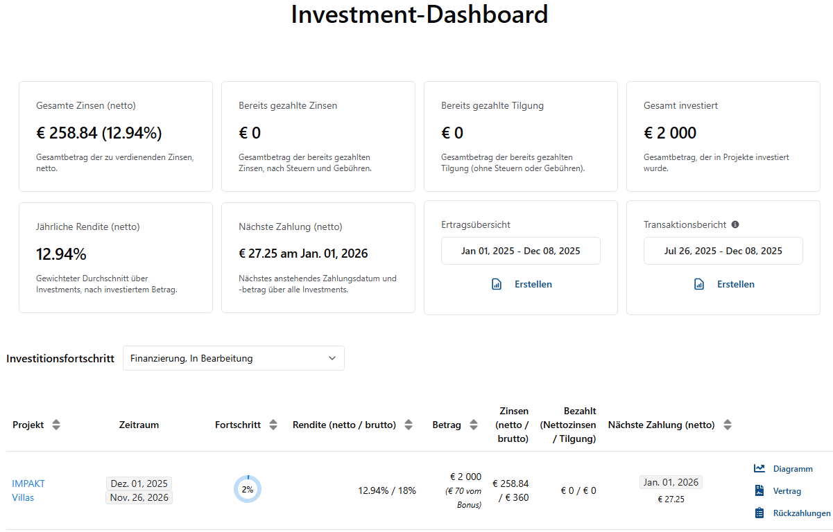 Ich habe am 19. November 2025 2.000 € in das Immobilien-Projekt IMPAKT Villen investiert. Es handelt sich um eine Wohnimmobilie in der rumänischen Stadt Cluj.
