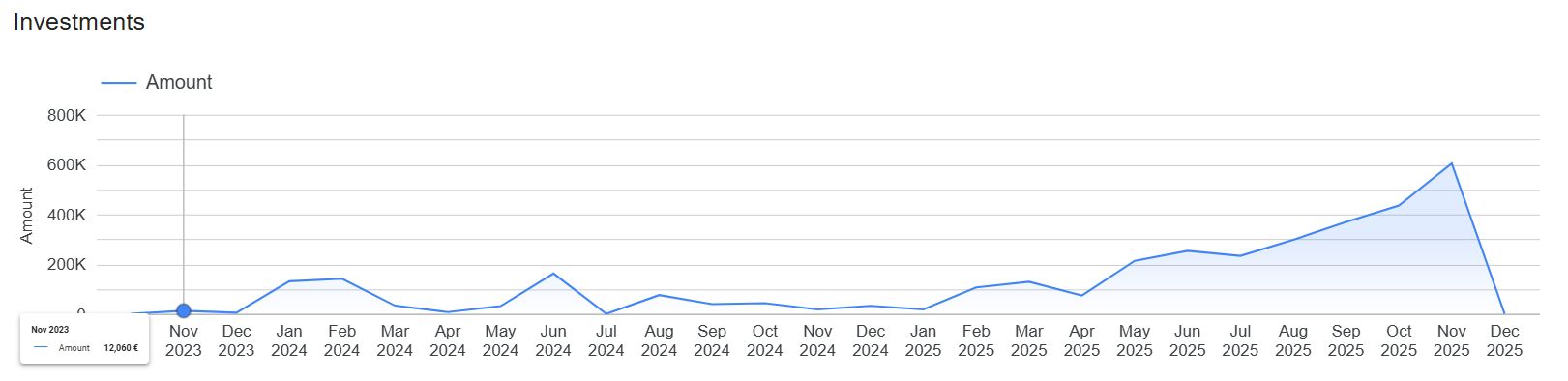 Seit 2025 sieht man einen stetigen Anstieg des Investitionsvolumens. Im letzten Monat wurden 604.000 € investiert.