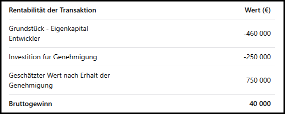 Die gesamte Investition beträgt also 710.000 €. Der geschätzte Wert nach dem Erhalt der Genehmigung beträgt 750.000 €: