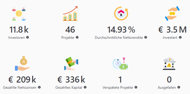 Bisher haben Anleger 3,5 Millionen € in 46 Projekten finanziert. Nur ein Projekt ist verspätet und kein Projekt bisher ausgefallen.