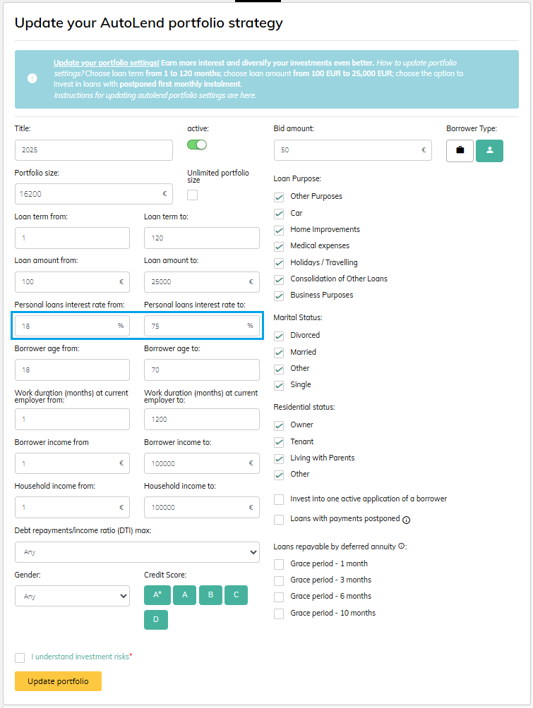 Den Mindestzins würde ich von 18 % auf 17 % senken, wenn ich bemerke, dass mein verfügbares Kapital ansteigt, weil der Auto-Lend nicht genügend Kredite findet. Das war aber jetzt noch nie der Fall.