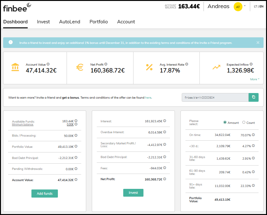 Mit einem Portfolio von knapp 50.000 € kann ich nun einen monatlichen Profit von 500 € erreichen. Auf keiner P2P-Plattform habe ich mehr verdient als bei Finbee. Ich habe bereits über 167.900 € an Zinsen erhalten. Meine Verkaufsstrategie rentiert bisher mit 17,1 % pro Jahr.