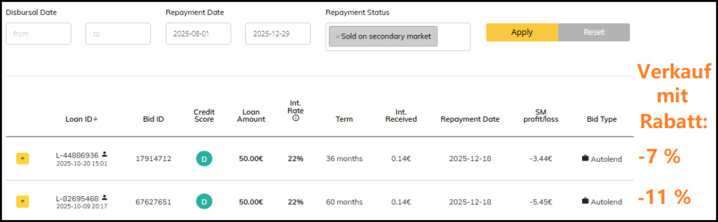 Ein Kredit konnte ich schon mit 7 % Discount verkaufen. Den anderen Kredit mit 11 % Discount.