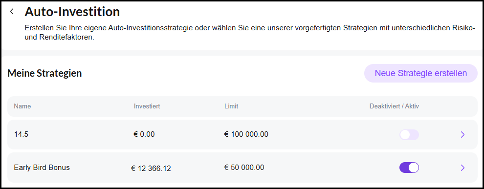 Immer wieder nehme ich Anpassungen an meinem Auto-Invest vor. In der Regel stelle ich ihn auf möglichst kurze Laufzeiten ein. Gibt es aber eine Aktion mit höheren Zinsen wie zur Zeit die 15,5 % Aktion, stelle ich meinen Auto-Invest auf möglichst lange Laufzeiten ein.