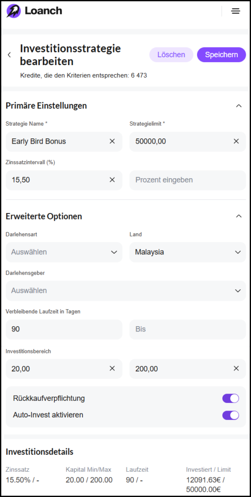 Bisher war er auf eine Restlaufzeit von maximal 45 Tagen und einem Mindestzinssatz von 14,5 % eingestellt. Die Restlaufzeit habe ich nun auf mindestens 90 Tage geändert und natürlich den Mindestzins auf 15,5 % erhöht. Damit profitiere ich möglichst lange von den höheren Zinsen:
