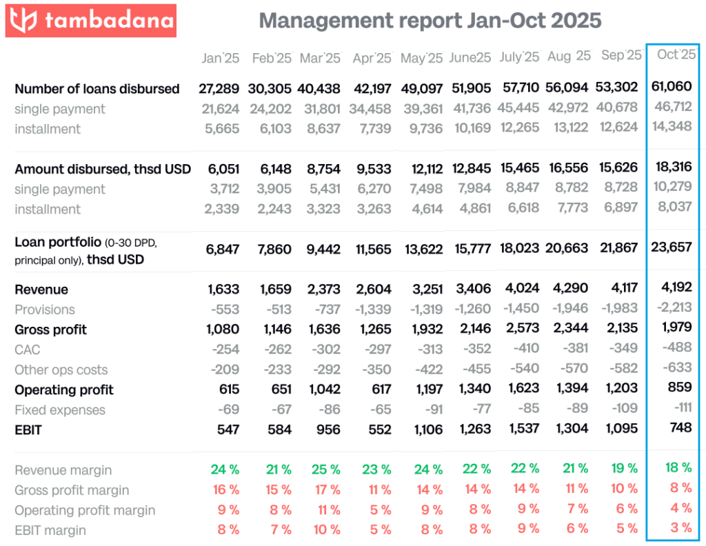 Im neusten monatlichen Management Report vom malaysischen Kreditunternehmen Tambadana wird ersichtlich, dass die Umsatzmarge (Revenue Margin) im Oktober 2025 auf 18 % gesunken ist. Die Bruttomarge, die operative Gewinnspanne und die EBIT-Marge befinden sich ebenfalls im Jahr 2025 auf ihrem niedrigsten Niveau.