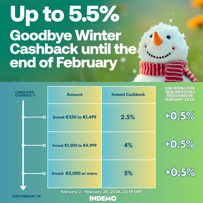 Neue Anleger, die im Februar 2026 bei Indemo investieren, erhalten 5,5 % Bonus auf alle Investitionen (Ab 5.000 € Gesamtinvestment), wenn sie sich über diesen Werbelink anmelden: www.Indemo.eu*