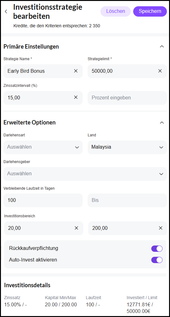 Die längsten Kredite laufen aktuell 6 Monate. So kann man sich die 15 % Zinsen auch für mehrere Monate sichern. Ich habe meinen Auto-Invest derzeit auf eine Laufzeit von mindestens 100 Tagen eingestellt.